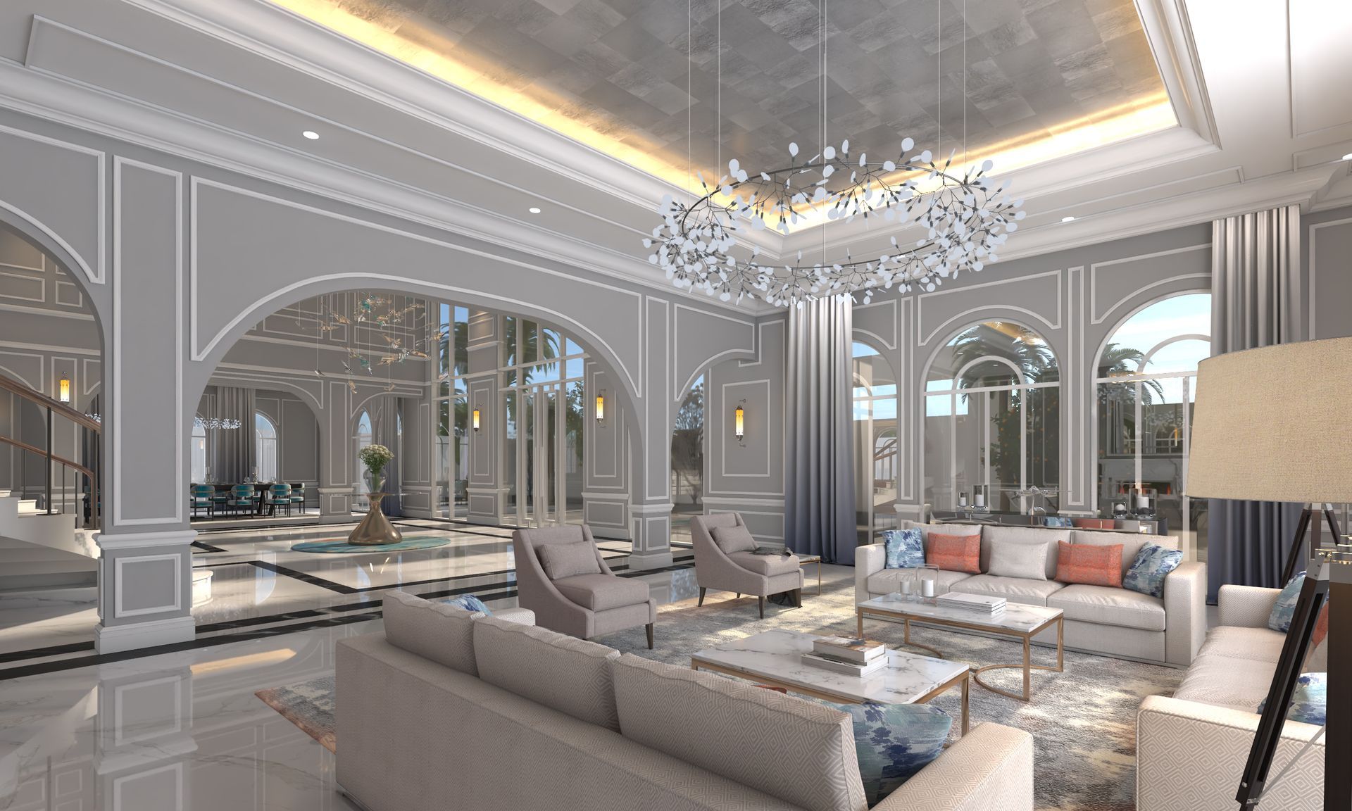 Consider a great room where light passes through an artful screen of carved stone, projecting intricate shadows across the floor. Or a dining room crowned by a ceiling that seems to hover, its perimeter lit with concealed LEDs that create a halo effect above the table.